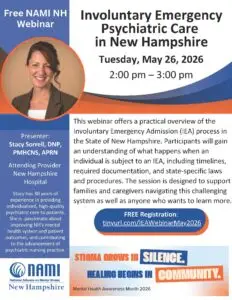 Latest News Like us on Facebook Upcoming Events This Is My Brave 2026 May 7, 2026 Cultivating Well-Being Through Boundaries May 14, 2026 Your Story of Recovery with Mental Illness - In Our Own Voice Speaker Training May 22, 2026 View all of our upcoming events, trainings, and classes Recent Blog Posts No Hate in the Granite State Volunteer Appreciation Week 2026 2026 NAMI NH Annual Awards – Nominations Open!