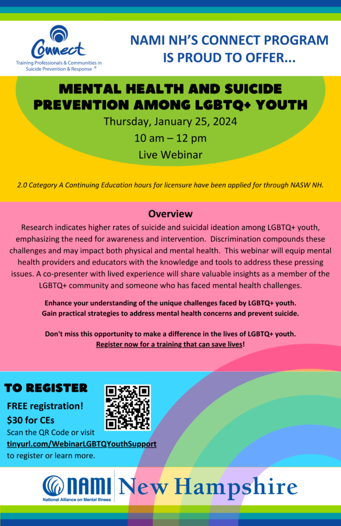 11/02/2023 @ 8:00 am – 4:00 pm – Registration has opened for the 20th Annual New Hampshire Suicide Prevention Conference “Community Connections: Empowering Everyday Helpers.” The single day in-person conference features the ways that communities at the national, state, and local levels are coming together to prevent suicide, specifically recognizing and strengthening the grassroots efforts around the state that are part of the […]